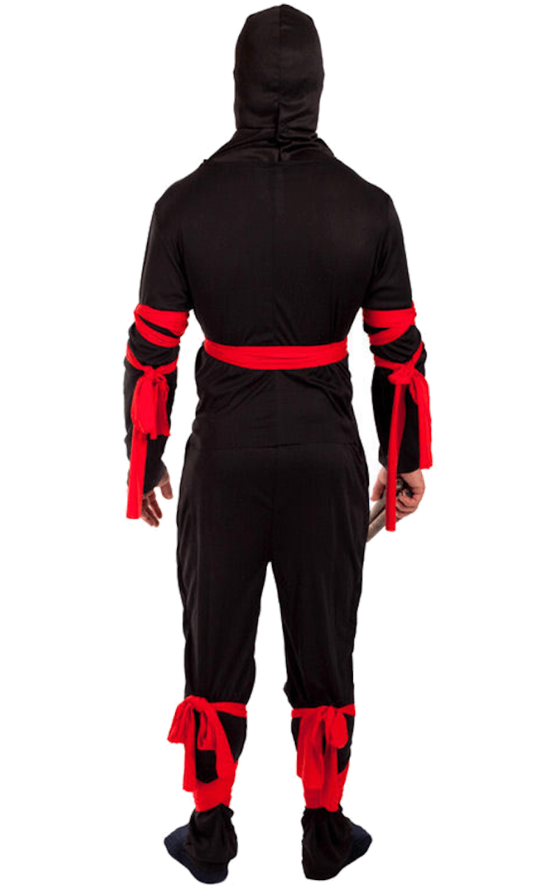 The Adult Dragon Ninja Costume is made up of a black top with matching trousers. It features red rope detailing around the legs, waist and arms, as well as intricate yellow illustrations of dragons printed on the upper chest. The costume also includes a black hooded headpiece to complete your ninja look.