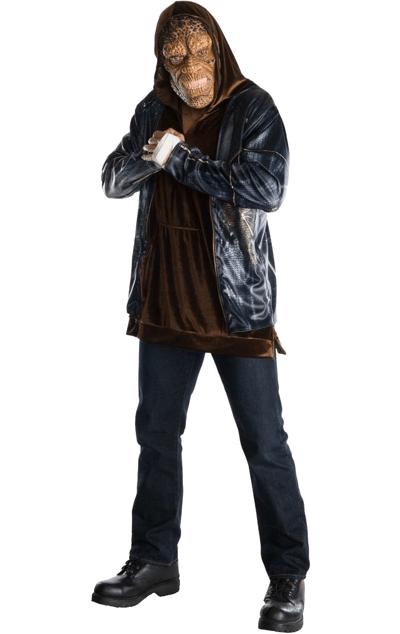 Lurking under the water until someone mentions a fancy dress party, Adult Killer Croc Costume -Nemesis of Batman – is ready to par-tay! The costume includes a hoody with attached jacket, facepiece and gloves.