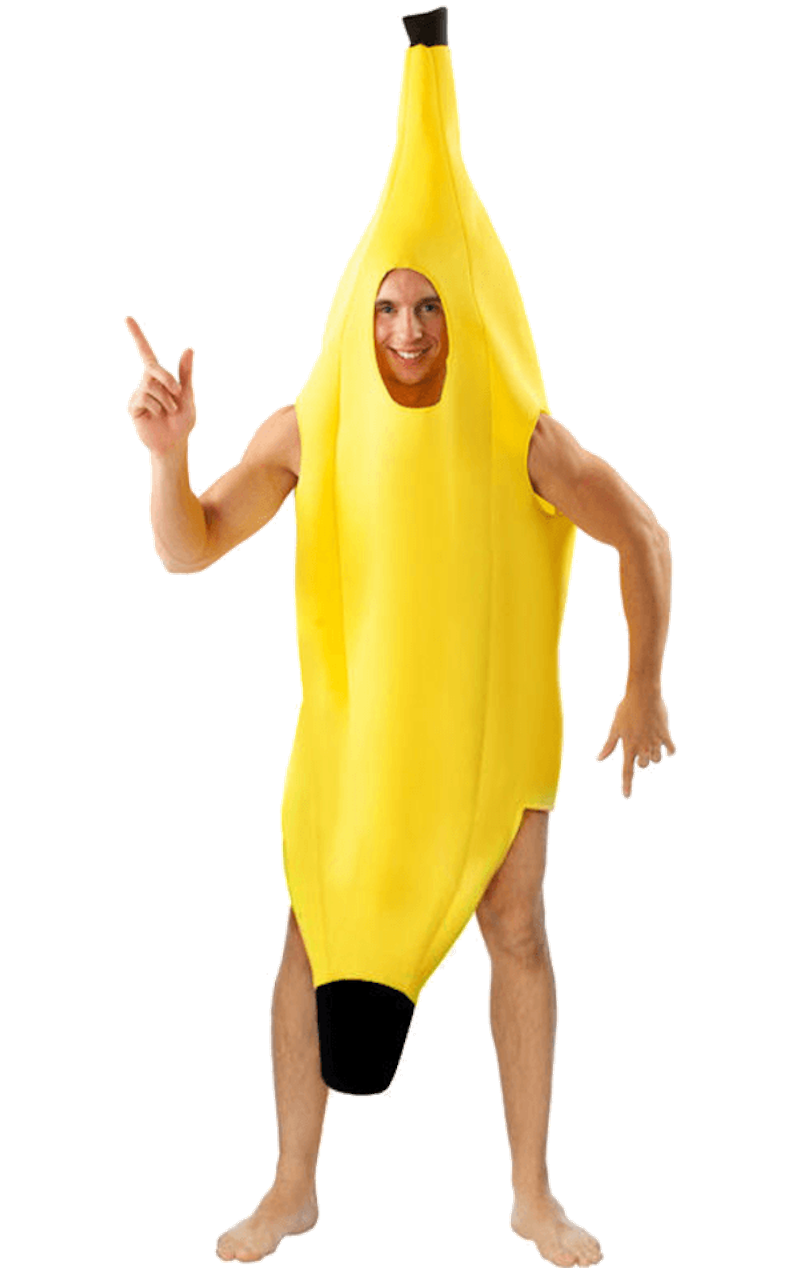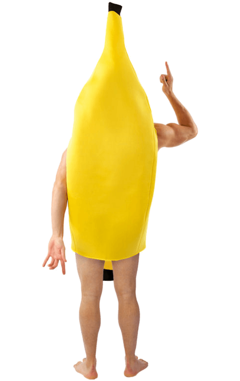 The Adult Novelty Banana Costume is made up of a vibrant yellow banana suit with cut outs for the face, arms, and legs for a comfortable fit. It also features black stalk detail to look like a real-life banana.