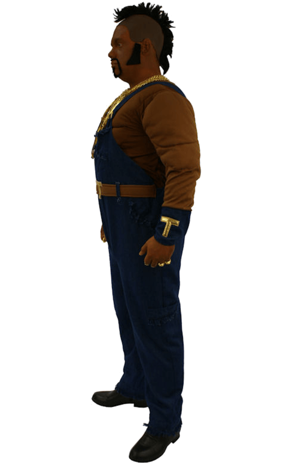 The Adult the A Team Mr T Costume is made up of brown muscle chest top so there’s no need to hit the gym hard to get in shape. It comes with all the added muscles you need to create the desired look. The costume also includes a pair of blue dungarees, a threaded gold bling necklace and the all important facepiece, which is extremely realistic. You’ll be looking just like Mr. T himself in a matter of seconds.