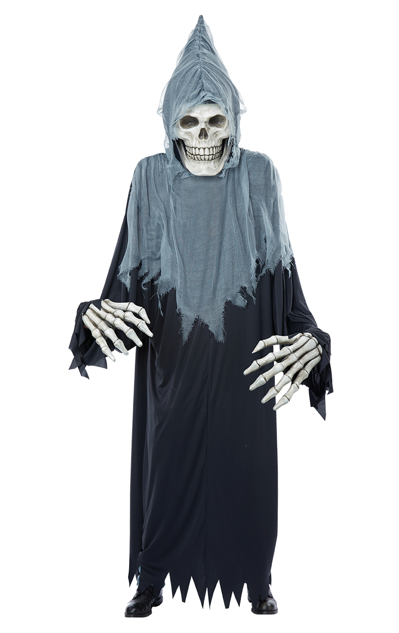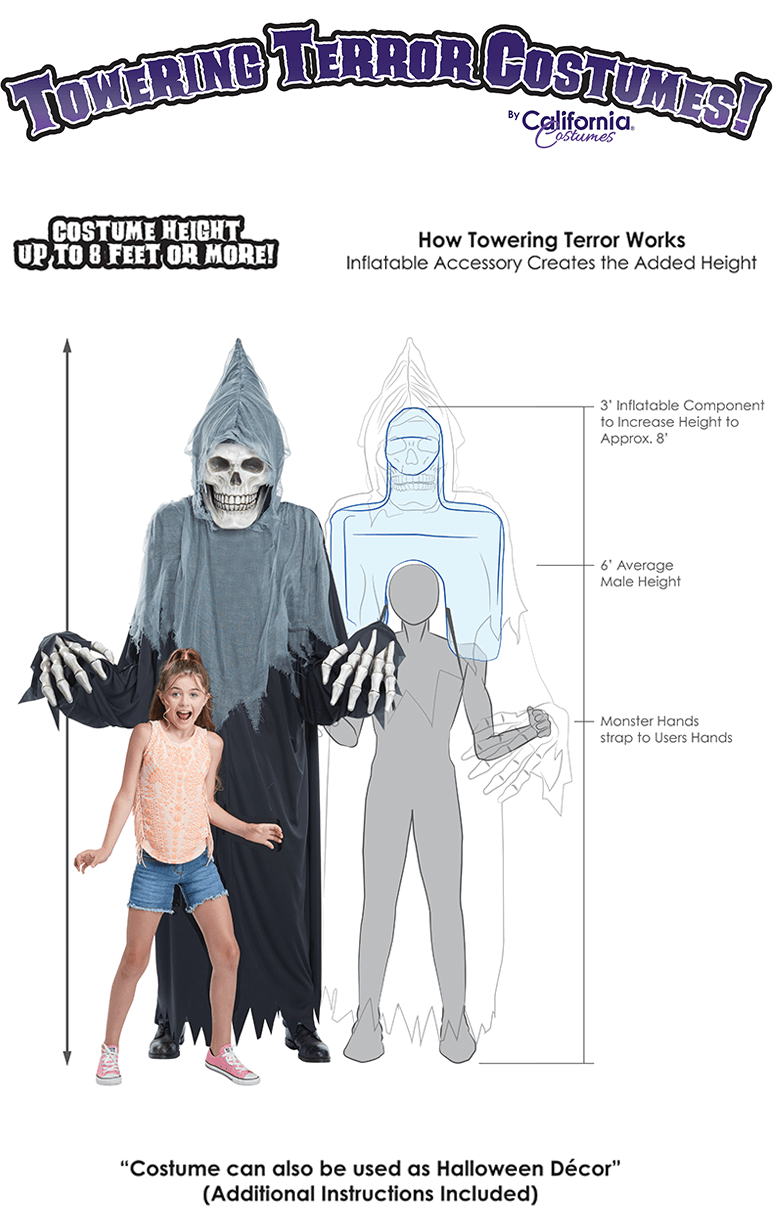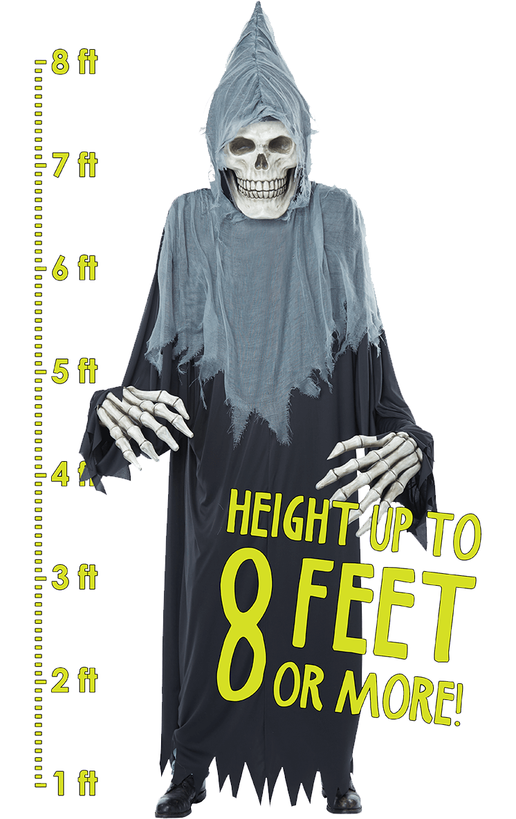 Be by far the scariest guest at any Halloween costume party with the enormous and terrifying Adult Towering Giant Grim Reaper Costume! This huge Grim Reaper costume adds two extra feet to you when you wear it with an inflatable head and shoulder piece and can make the wearer over eight feet in height. The fabric chest piece lets you see through it, and the hands are easily attached to your own. It can also be used as a horrifying Halloween decoration to scare trick or treaters! It will definitely cause a scream!