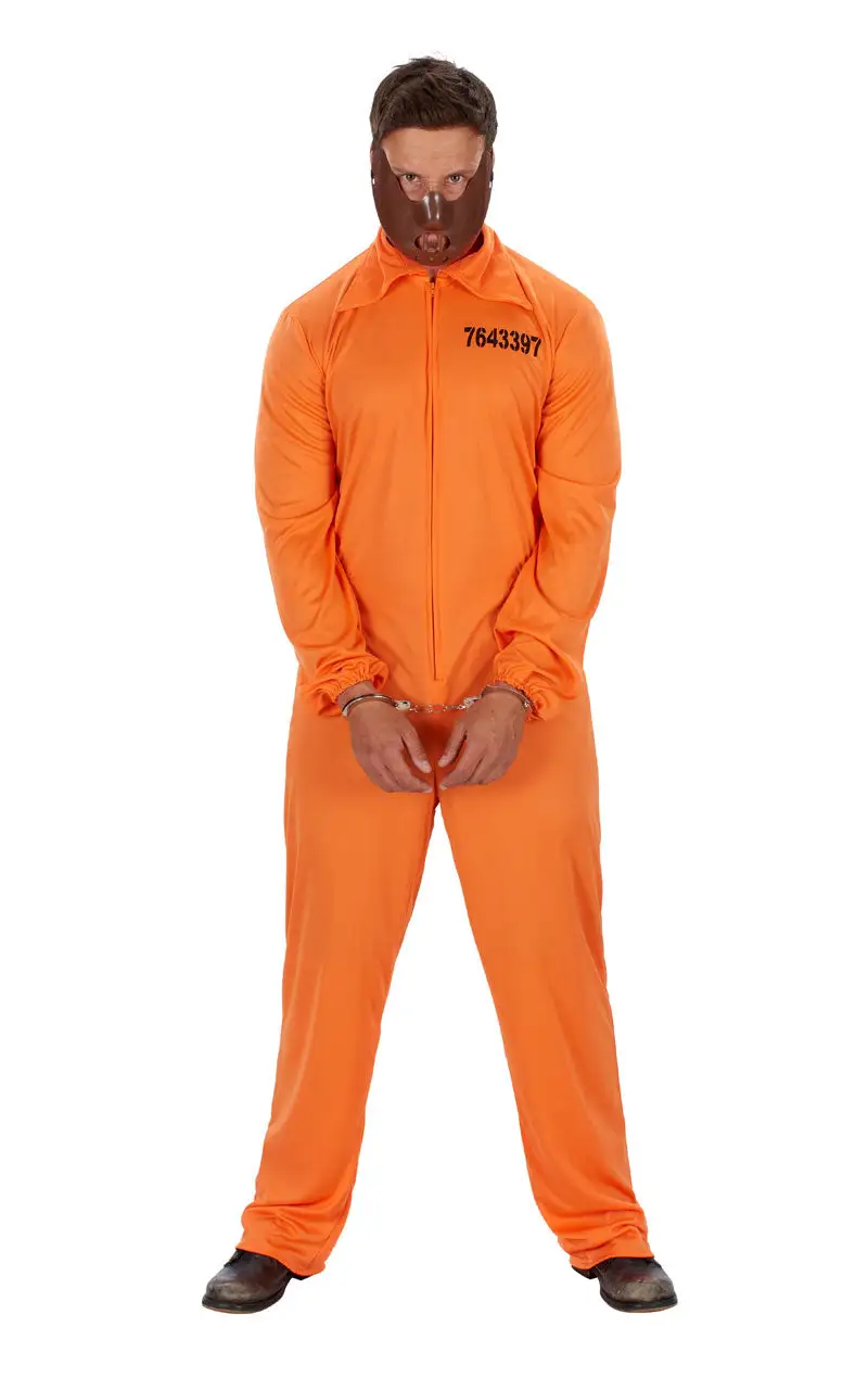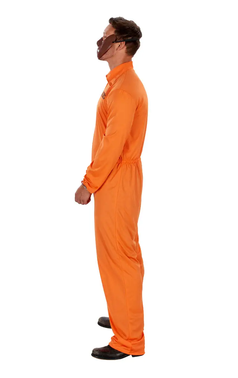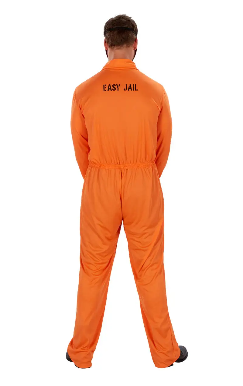 The Adult Unisex Prisoner Costume consists of an all-in-one bright orange jumpsuit, with a front zip that can be done up all the way to the top, or for the ladies, done up halfway to show off some cleavage. The jumpsuit features the prisoner number ‘7643397’ on the front and the words, ‘EASY JAIL’ written in black block print on the back.