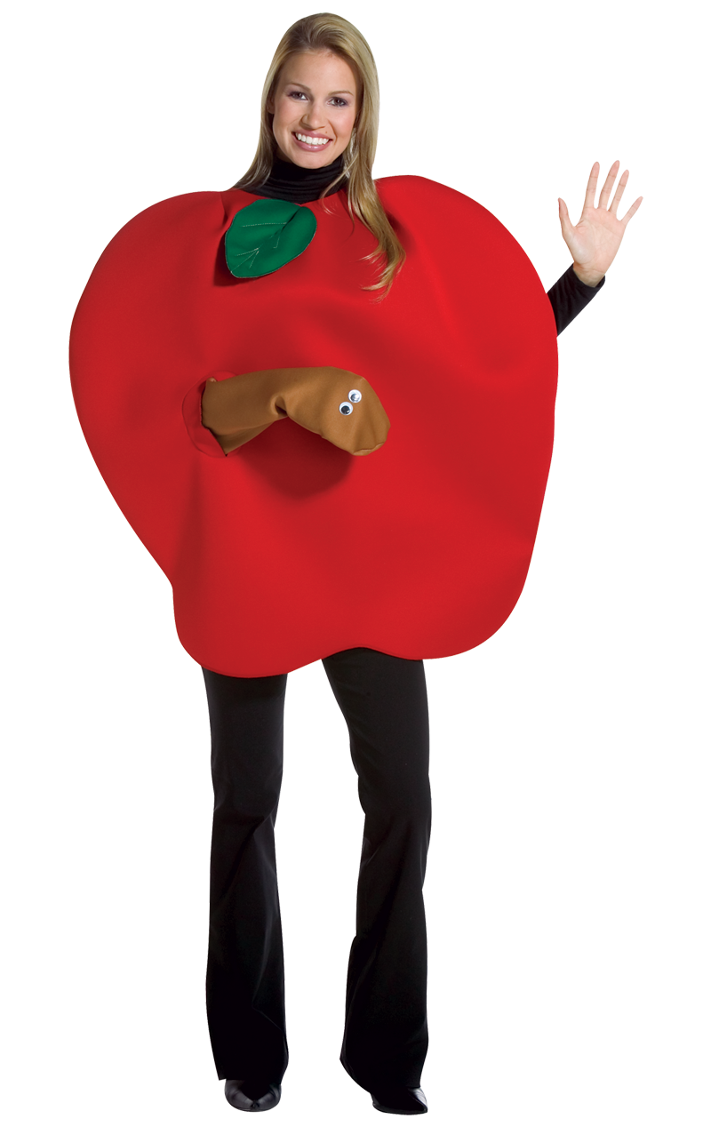 This soft poly foam apple costume simply slips over the wearers head, there are two arm holes in the back of the costume, but you can also slip your hand into the attached worm section and slip it out through the hole in the front of the costume. The costume is made of poly foam, 100% polyester fabric backed with foam to give it more body. Costume shown here with models own black trousers and long sleeved top (not included).