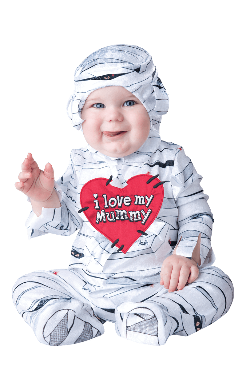Our Baby I Love My Mummy Costume comes complete with a one-piece that features a unique pattern, making it look as though your little one is wrapped up in tissue paper. It also features a red heart in the middle with the words, ‘I love my mummy.’ The outfit includes a detachable headpiece that features the same pattern as the jumpsuit.