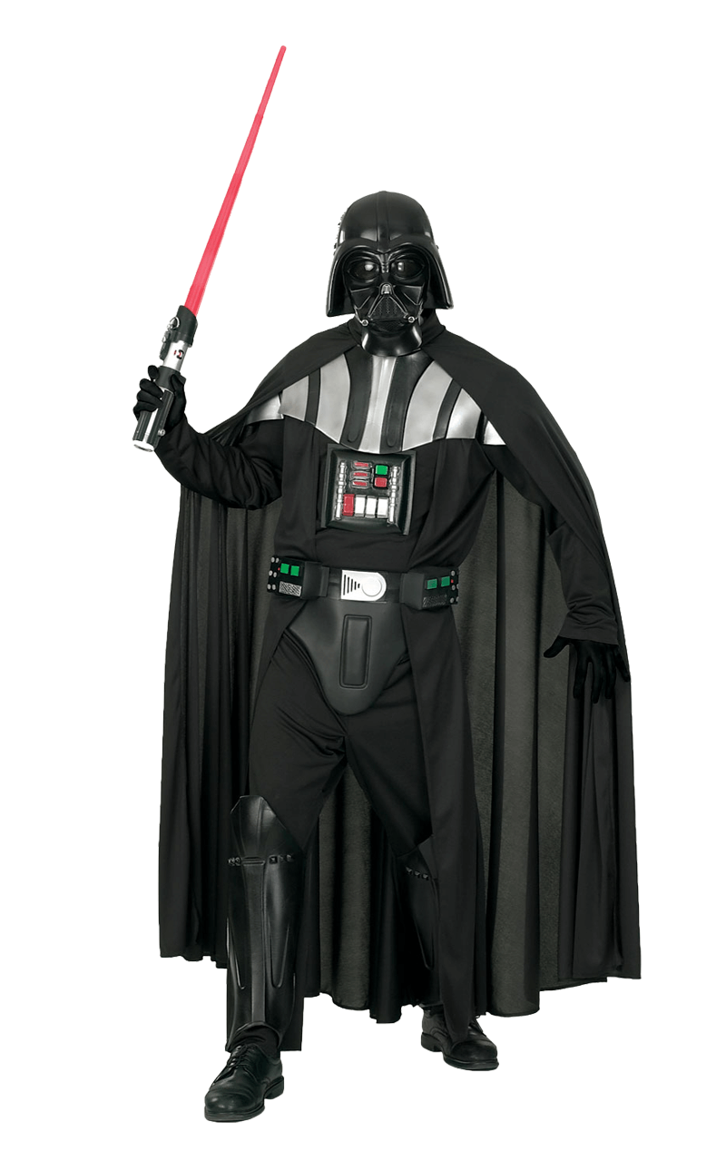 Deluxe Darth Vader jumpsuit with attached moulded collar chest-box, cod-piece, bootcovers, a helmet held in place with elastic, a belt that features moulded sections at the front and a cape that is attached to the collar.