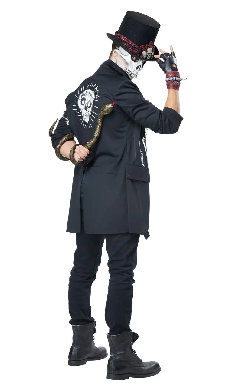 The Adult Plus Size Voodoo Dude Costume features a long-sleeve black jacket with various patterns stitched onto the front, plus an attached red vest. To ensure you’re looking the part, put on the smart black hat with skull detailing and white, skeleton-like facepiece, then you’re all set to start casting spells.