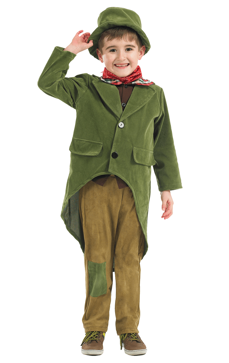 The Childrens Dickensian Boy Costume comes complete with a green jacket with a button front fastening and an attached waistcoat underneath. The outfit also includes a pair of brown trousers with a green patch on the right leg. To finish off the ultimate Dickensian Boy look, it also comes with an olive-colour bucket hat.