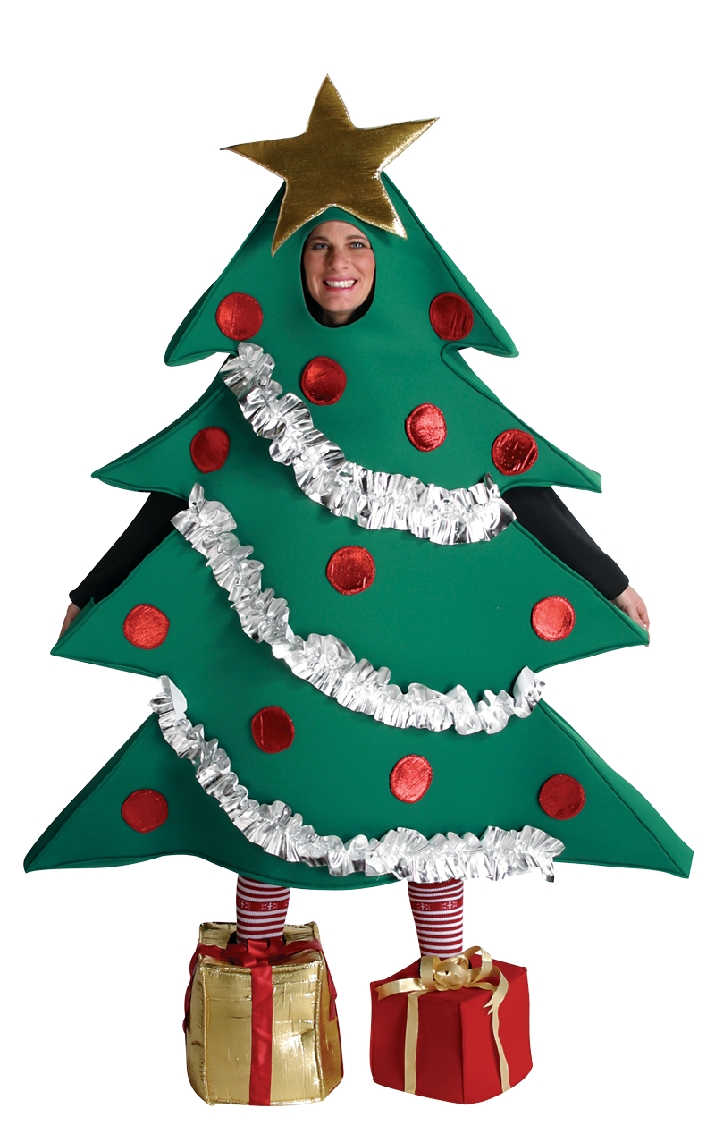 The Christmas Tree Costume is made up of a fantastic green tree tunic covered in glistening silver tinsel and shimmering red baubles. It also features a metallic gold star at the top. You can’t forget gifts under the Christmas tree, but don’t worry we have that covered! The included present shoe covers are trimmed with ribbon and bows to complete the fun, festive look.