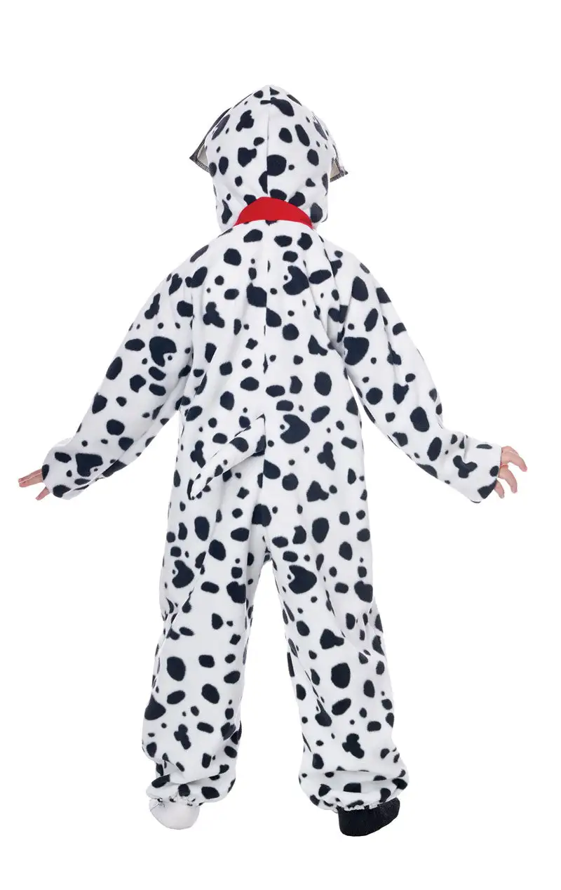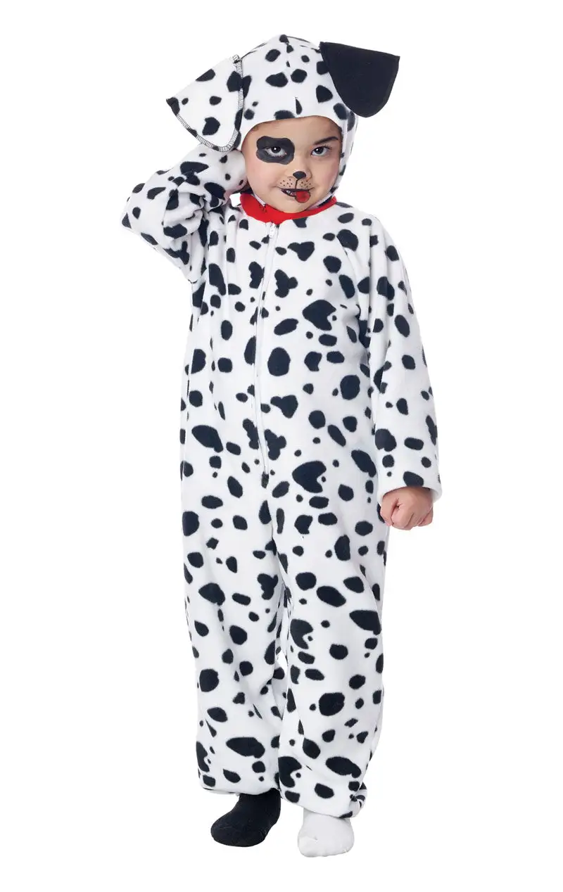 The Kids Dalmatian Puppy Fleece Jumpsuit Costume consists of an adorable all-in-one black and white spotted jumpsuit with a front zip fastening. The jumpsuit features an attached tail at the back, along with an adorable dalmatian hood with droopy ears. Paint on some puppy eyes and a bright red tongue and your toddler will be all set.