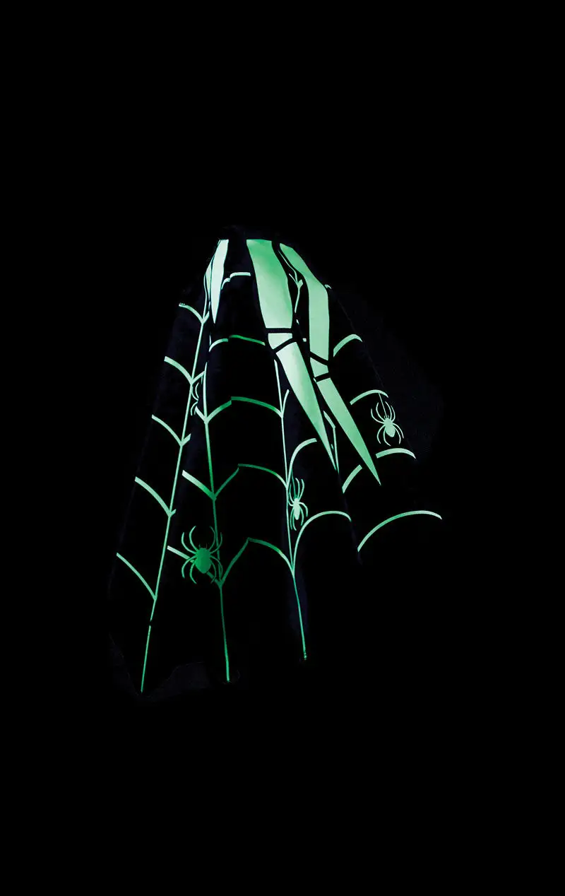 The Kids Glow-in-the-dark Spider Poncho Costume consists of a black poncho with intertwined, white webs all over. The best feature of the poncho is that it glows bright green in the dark, making it extra spooky for Halloween. The costume also comes with an attached furry black hood, featuring 4 googly eyes on the front.