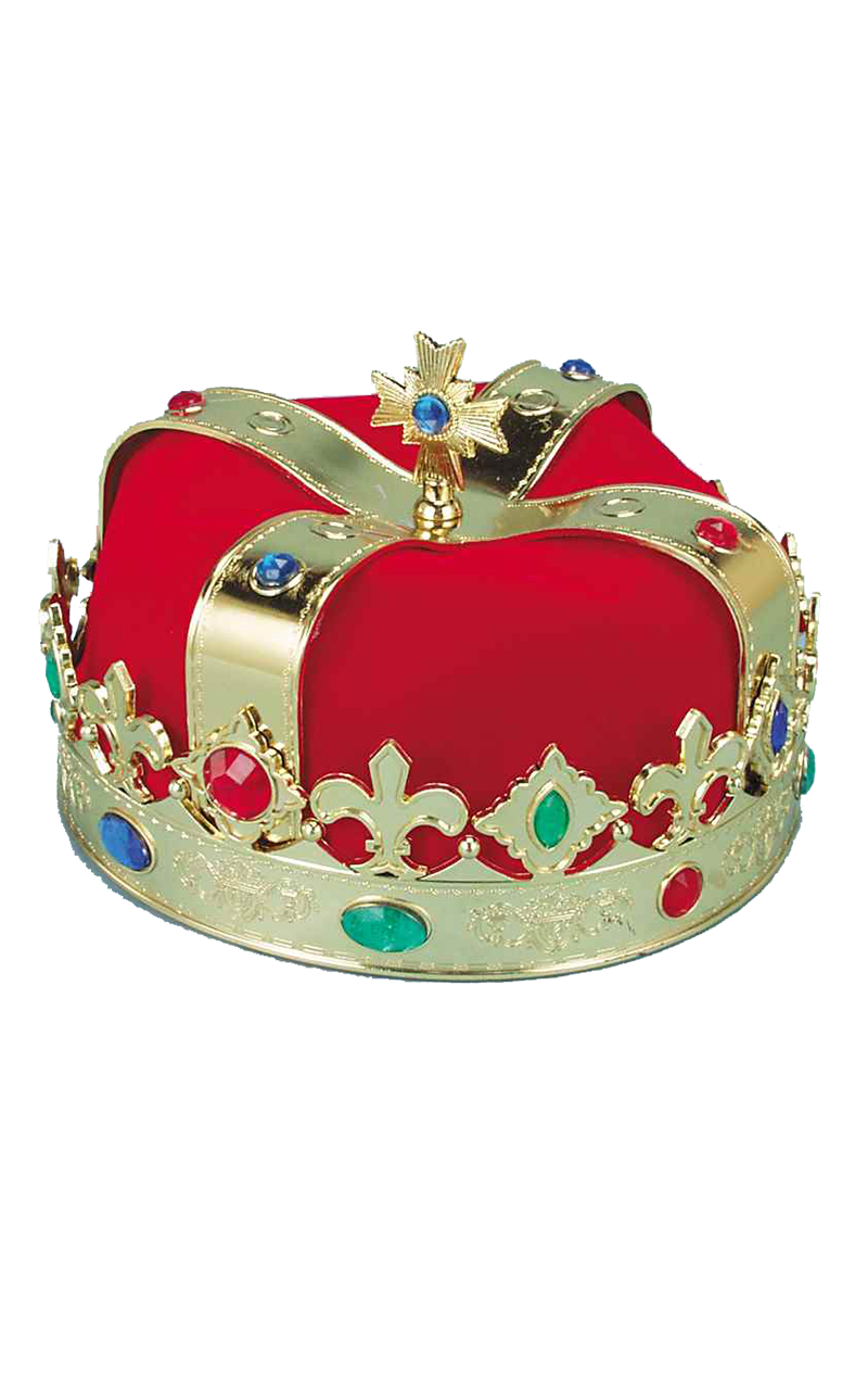 Golden plastic crown lined with a red velveteen fabric sprinkled with glitter and has inset with several multi coloured jewels.