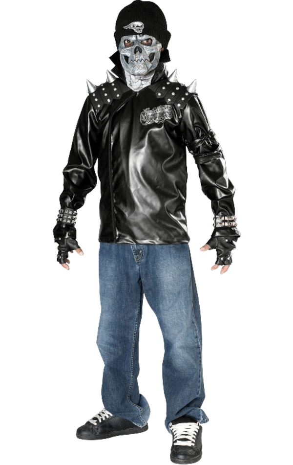 Turn up to the Halloween party revving your engine, everyone will turn to look at the coolest ghoul who has just arrived! Your child will love the Kids Death Skull Biker Costume for trick-or-treating. It features a metal look skull facepiece with an attached beanie hat, as well as a leather look studded biker jacket and fingerless gloves. Your little one is sure to collect all of the best sweets when out on Halloween when wearing this rocking outfit!