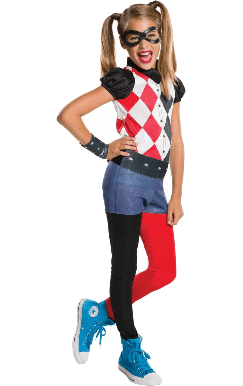 The Kids Harley Quinn Costume is made up of a signature Harley Quinn red, white and black argyle jumpsuit with a denim effect and lots of unique details. Completing the look is a black belt with a printed stud effect, a matching wrist band and a black eye piece.