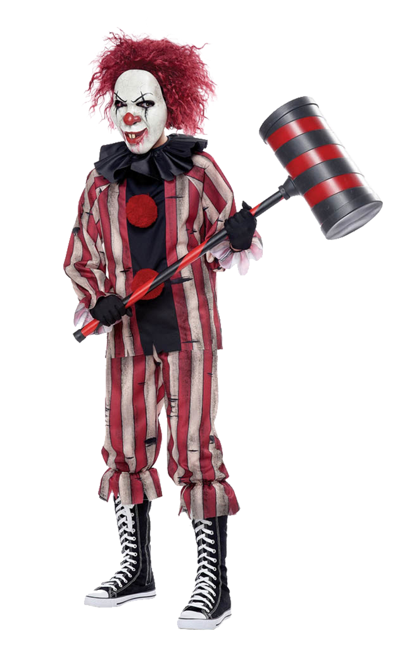 The Kids Nightmare Clown Costume is made up of a red, white, and black striped vintage clown top, with matching trousers and a black neck ruffle collar. Completing the look is an evil facepiece with a white face, creepy blood-streaked grin and classic red nose. It’s a look that will encourage many screams!