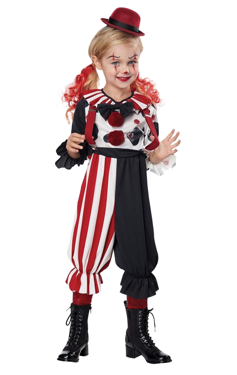The Kids Unisex Clown Costume is made up of a pair of contrasting trousers, with black on one side and red and white stripes on the other. It also features a matching long sleeved top with a striped ruffled frill collar, an attached black bow, and red pom poms down the centre. Completing the look are red suspenders and an adorable bowler hat, giving them the ultimate circus clown look.