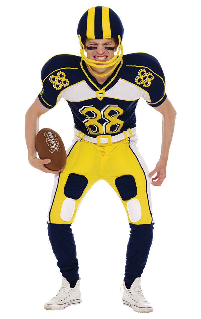 The Mens American Football Costume is made up of the uniform that’s recognised worldwide. It features a blue and yellow jumpsuit with the number motif on the front, with a matching American football helmet. It also includes a toy American football, so everyone will know you are prepared and ready to claim victory!