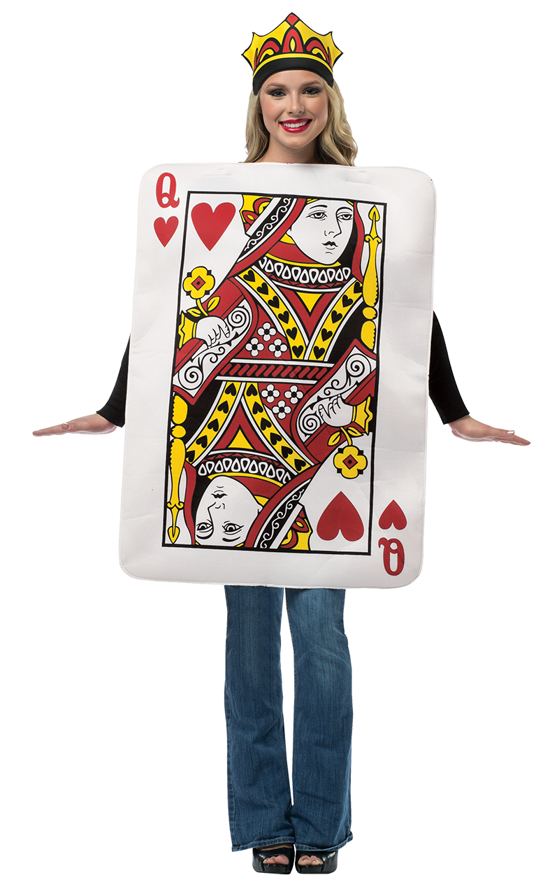 This Queen of Hearts Card Costume features a large queen of hearts tunic that fits on over the head. To complete the ultimate royal look, the outfit also comes with a crown.