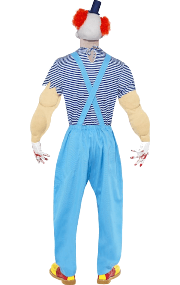 The Mens Bubbles the Evil Clown Costume includes a pair of bright blue pants with braces and a nautical top, featuring tattooed strong man arms with muscle padding. Completing the look is a bloody clown facepiece with attached orange hair and a small blue top hat. You have everything you need for a truly terrifying clown look.