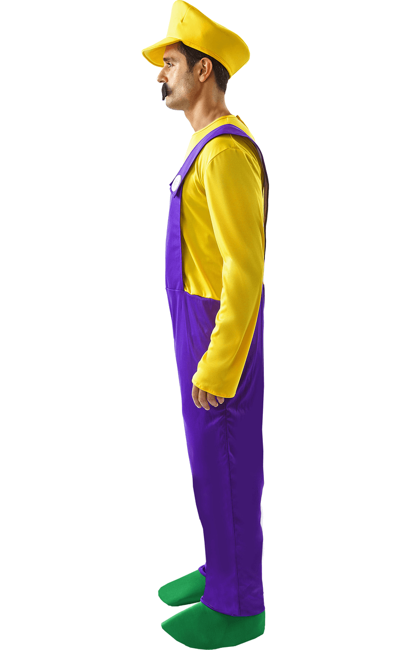 The Wario Super Mario Costume includes a purple jumpsuit made to look like dungarees, with a yellow long sleeved top attached. Completing your menacing Wario look is the classic yellow cap.