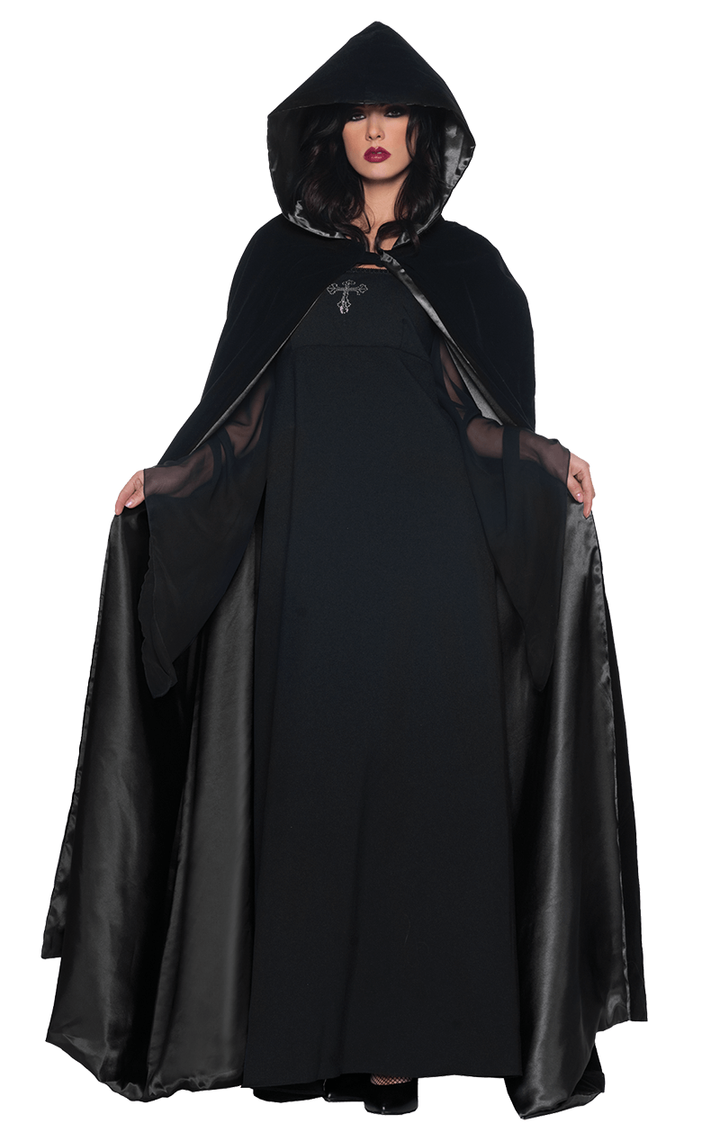 Knock knock, who’s there? It’s your worst velvet nightmare! Bring some elegance to any Halloween party with this Womens Black Velvet And Satin Cape! Whether you are a blood sucking vampire or a dead Snow White, this cape is the fairest / handsomest of them all!