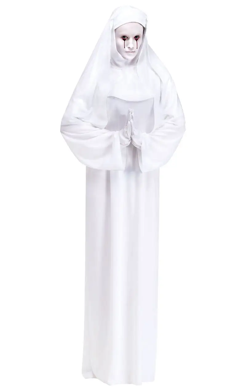 The Womens Scary Mary Nun Costume includes is made up of a white gown with wide sleeves and a tie fastening at the back of the neck. Completing the look is a matching white nun headpiece with an attached collar and veil, plus a pair of white gloves. The finished look will really make you look like you’ve risen from the dead. Add some white face paint and white-out eye accessories for the ultimate demonic and ghostly look. Why not whip out a screamer knife from under your gown, or squirt yourself with lashings of fake blood?