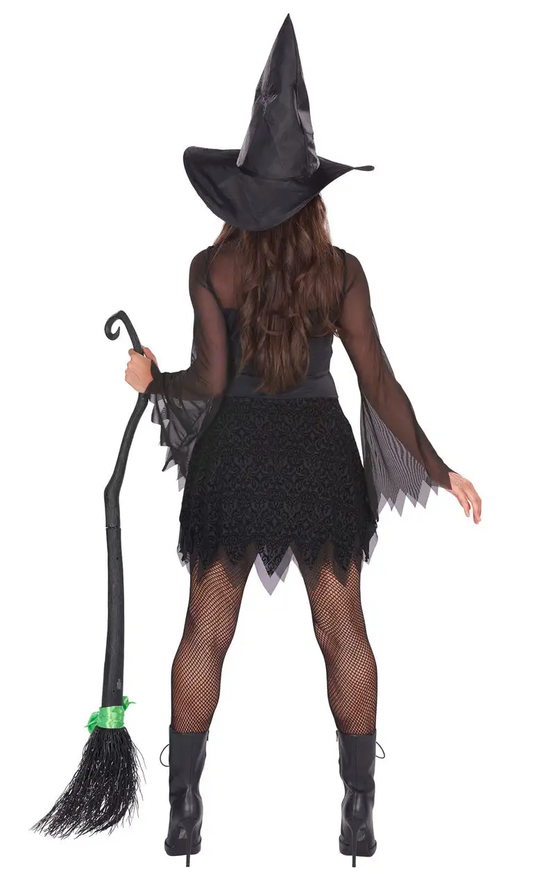 The Sorceress of Darkness costume comes with a short black dress with meshed bat-wing sleeves. The corset of the dress has criss-cross ribbon detailing down the front and a ragged edged skirt. We can’t forget about the hat, as no witch would be complete without one.