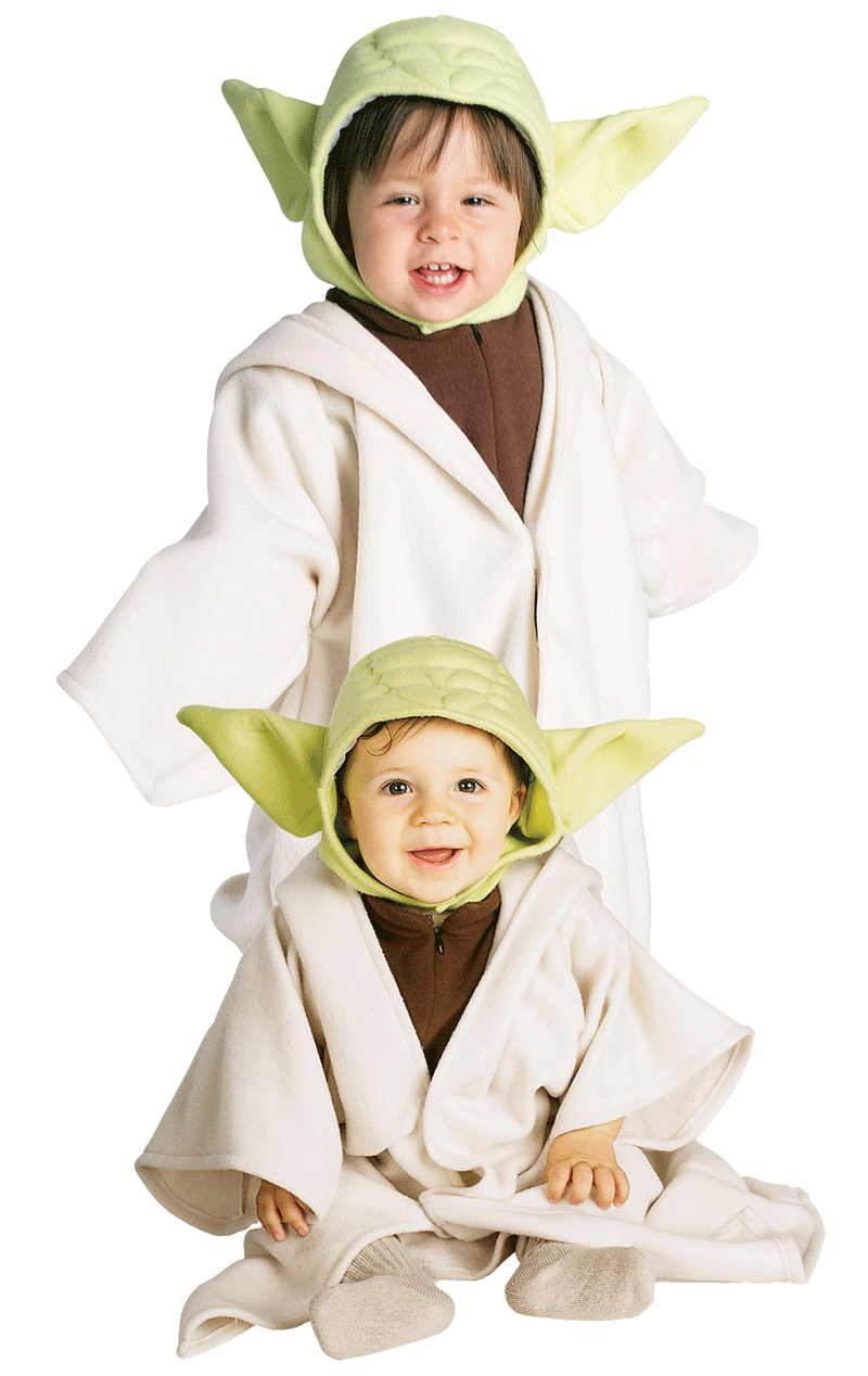 The Yoda Toddler Costume comes complete with a long sleeve white robe with a brown mock shirt underneath. To complete the ultimate Yoda look, the outfit also includes a green headpiece, which fastens just beneath the neck.